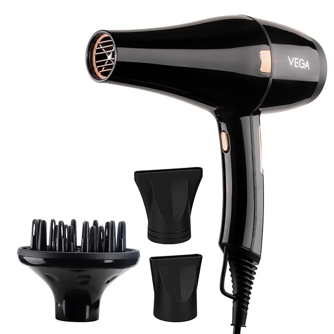 Vega Pro-Xpert 2200W Professional Hair Dryer for Women with 2 Speed/3 Heat Settings, Cool Shot Button, Diffuser & 2 Detachable Nozzles, Travel Friendly, (VHDP-03), 2000 Watts, Black